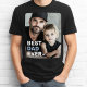 T-shirt med anpassningsbarnas foto och texten "Bästa pappa någonsin" som ett vitt och ljusblått överlägg i grund lämnat hörn.