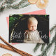 Det här söta men moderna födelsemeddelandekortet för semestern har en vit kalligrafiskrift över ett helsidigt, horisontellt foto. Den kalligrafiska hälsningen på framsidan lyder "Bästa presenten någonsin". Den här designen rymmer ett enda, horisontellt foto på framsidan av kortet. På baksidan hittar du ett festligt rött och vitt horisontellt randmönster som kan tas bort eller anpassas. Du kan också lägga till ett annat foto eller text på baksidan genom att välja "anpassa designen ytterligare".