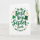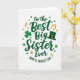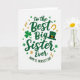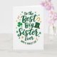 Denna gratulationskort har budskapet "till den bästa storesystern någonsin" staplade ner i mitten med flytande smaragdgrön text, med en mjuk skugga som ger orden en mjuk höjning 💚. En liten shamrock står istället för en punkt i texten och tillför en söt liten blinkning som känns som ett skämt mellan nära syskon ☘️. Nära botten böjer sig "HAPPY ST. PATRICK'S DAY" i mindre grön text, prydligt placerad under huvudbudskapet. Bakgrunden är klar vit, vilket får det gröna och varma guldaccenten att sticka ut tydligt. Runt texten ser du en fyrklöver, en leprechaunhatt med en guldbeslag, och små detaljer i form av en guldhästsko och stjärnskott som ser ut att vara strödda i feststämning. Hatten sitter ovanför ordet "Sister", som om den placerats där