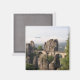 Rund fotomagnet från souvenir i stenbron Bastei (Bastei Brücke) över Elbe-floden som förbinder de ikoniska sten-formationerna av Elbe Sandstone-bergen nära Dresden i nationalparken Saxon Schweiz (Sächsische Schweiz) Tyskland i öster.