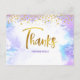 Se till att din favorit Bat mitzvah visar hennes uppskattning för alla som stödde hennes milstolpe-händelse! Skicka ut det här fantastiska, moderna, glansfulla handskrivna skript i guld-faux-folie och små punkter som täcker en lätt lila vattenfärgsbakgrund, tack vare personligen. Anpassa till namn i din Bat mitzvah. Lägg till en anteckning på baksidan, antingen genom att ändra exempelkopian eller genom att helt och hållet ta bort den för en handskriven anteckning. Garanterade att hennes korrespondens fick en snyggt. Matchning och samordning av inbjudan, kuvert, adressetiketter, klistermärken, platskort, bordsnummer, blöjor, album och andra Bat mitzvah föremål finns också i detta trendig och i speciell insamling. Skriv bara i namn på framsidan, lägg till ditt personlig-meddelande och din returadress på baksidan, och du kan enkelt anpassa det här tack som du vykort för. Var snäll och meddela mig med eventuella frågor eller förfrågningar.