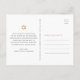 Se till att alla dina vänner och släktingar fortfarande kan fira din dotters stora Bat Mitzvah, oavsett nuvarande globala oförutsedda omständigheter. Skicka ut detta snygga, personliga ”Ändring av planer” vykort. En fantastisk rosa och persikofärgad blomsterakvarell med förgylld skriftstil och modern dammig rosa och grå sans serif-typografi ovanpå en mjuk rosa bakgrund med konfettipunkter. Anpassa den anpassade texten med din Bat Mitzvahs namn och datum. Ditt anpassade meddelande, en gyllene Davidstjärna och din returadress pryder baksidan. Se till att hennes speciella firande fortfarande blir lika festligt som ursprungligen planerat!
