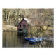 En fotografisk utformning av blå båtar och en gammal bårstuga vid sjö.