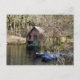 En fotografisk utformning av blå båtar och en gammal bårstuga vid sjö. Wales UK.