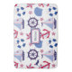 En roligt nautiska mönster är ett kännetecken på detta färgstarka badmatt. Bilder i mönster omfattar svält, sjöslingor, fraktens hjul, ett ankare, en banderoll och en segelbåt. Den marinblå, medelblå och röda mönster placeras på en vit bakgrund. Ditt barns namn är på en vit banderoll som är klädd i rött och blått och placerad i mitten.