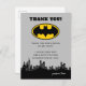 Visa din tacksamhet i superhjälte-stil med detta Batman Gotham City födelsedags tack-kort! Med den ikoniska Gotham-horisonten och Bat-Signal som lyser mot natthimlen är detta kort perfekt för att tacka gäster efter en oföglig fest. Med djärva grafik och anpassningsbar text är det ett roligt och stilrent sätt att uttrycka din uppskattning.