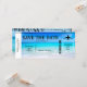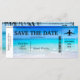 En vacker bild vid sidan är bakgrunden till Boarding Pass Destination bröllopSpara datumet. En personligt bröllp-design för målet roligt. Tropiska stranden med akvabblyor och modern text.