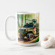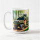 Bilden visar ett robust, kamouflerat militärt fordon som är stationerat i en ljus, lush djungel-inställning. Fordonen är målat i grönt, brunt och brunt mönster, designat att blanda med omgivningen. Dess stora, tåliga däck är byggt att hantera grovt och ojämn terräng, och ram är förstärkt med bepansrad plätering. En monterad vapenturret placeras ovanpå, redo för strid och ett nättäcke över bakluckan, vilket ger ytterligare hemlighållande. Framsidan av fordon har en djärv, röd stjärna, som ger utmärkande drag åt dess design. Solljusfilter genom kanopin ovan, som kastar en varm, applåderad glöd över scenen och belyser de svåra detaljerna i fordon medan den täta gröntens löv omger den, och understryker militärbilens beredskap för strid i en krävande djungelomgivning.