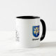 Mug with drawing and coat of arms of the famous German battleship Bismarck of world war II with the name of the ship written with fraktur letters.