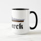 Mug with drawing of the famous German battleship Bismarck of world war II with the name of the ship written with fraktur letters.