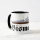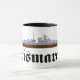 Mug with drawing of the famous German battleship Bismarck of world war II with the name of the ship written with fraktur letters.