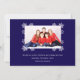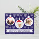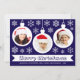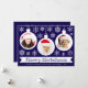 Ett julkort med foto för en familj med barn. Det har 3 vita glaskulor med runda foton i: en flicka, en pojke och en baby, alla med röda tomtelovor. Glaskulorna är omgivna av vita snöflingor. Meddelandet God Jul är skrivet i en vit banderoll, med namnen under i versaler. Bakgrunden är mörkblå.