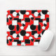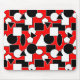 Den här musmattan har en Bauhaus-design av trianglar, cirklar, rektanglar och pentagoner i svart och vitt på en fält av rött.