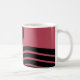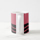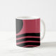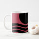 Mugg har bauhaus-design av vågigt linjer och cirklar i svart på en fält av djup rosa.
