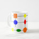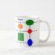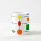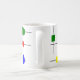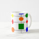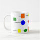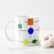 Mugg har en Bauhaus-design av ett rutnät med former i rött, gult, orange, grönt och blått ritade på det.