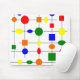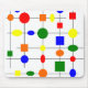 Den här musknappen har en Bauhaus-design av ett rutnät med former i rött, gult, orange, grönt och blått ritade på den.