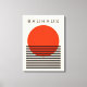 Ett modernt konstverk i Bauhaus stil på en orange röd sol med svart vågrät linjer.