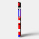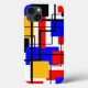 Det här telefonfodralet har en Bauhaus-design av rektanglar och fyrkanter med svart linjer som går genom designen på en vit fält.
