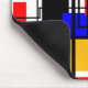 Den här musknappen har en Bauhaus-design av rektanglar och fyrkanter med svart linjer som går genom mönstret på en vit fält.