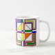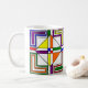 Mugg har en Bauhaus-design av linjer, trianglar, diamanter och fyrkanter som skapar ett nedfläckad glasutseende i primär och sekundär färg.
