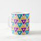 Mugg har en Bauhaus-design som består av upprepade trianglar i guld, turkos, teal, lila och lätt guld. Om du tycker om designen men föredrar olika färg, säg mig.