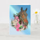 Ett bay hästhuvud ramas in av en hästsko och rosa och vita rosor mot en blå bakgrund på detta födelsedags kort. Perfekt för alla som älskar hästar!