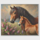 En kultiverande målning med en buksto som står skyddande bredvid hennes föl i ett vibrerande fält av vilda blommor. De mjuka penseldragen och de levande detaljerna fångar det ömma bandet mellan hästarna, mot en sund och färgstark landskapsbakgrund.