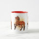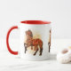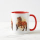 Jag har älskat karuseller sedan jag var barn. De vackra djuren och musiken från karuseller som ställs upp på mässor och parker har en särskild plats i mitt hjärta. Detta inspirerade mig att rita några karusellhästar på egen hand och sedan färglägga dem med akrylbläck. Akvarellen av en bayersk häst dekorerad i rött och gult som pryder denna mugg är ett av resultaten.