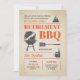 Pension BBQ-inbjudan med en rustik återblick. Utformningen har en vintage som tittar struktur bakgrund och en störd effekt på brev och grafik. I illustrationerna ingår grill, grillredskap, låga, öl och mugg. Denna unika utformning är perfekten att fira ett pension med familj, vänner och kolleger.