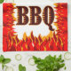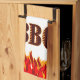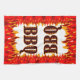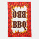 En handduk som läser BBQ i ett westernt flammande teckensnitt för kokar och kokokokokokokokokokokokokokokokokokokokokokokokokokokokoser. Med bilder av rött och orange i grund i designen.