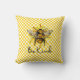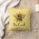 Sunny och skarp dekorativ kudde-design har en gult och vit schackbräda mönster med fuzzy gult och svart bin och solblommor överlägg samt texten "Be Kind".