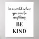 Modern Black & White BE KIND Inspirational Motivational Typography Poster. Underbart citat: "I en värld där du kan vara vad som helst, är du snäll." Visas i svart text på vitt. All text, färg, är anpassade.