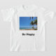 T-shirt med ett avslappnande tropiskt öfoto och ord "Be Lycklig". Texten upprepas på baksidan.
