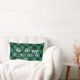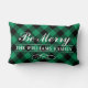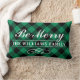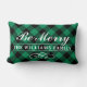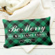 Säsong julen i dekorativ kudde har "Be Merry" i mjukt vitt skript med anpassningsbar monogramtext och rustik grönt och svart buffel-pläterad baksida.