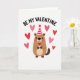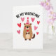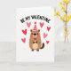 This greeting card shows a cute beaver-like animal in warm brown tones, with rosy cheeks and big wide eyes that look a little shy and sweet. It’s wearing a red-and-white striped party hat with a small red pom-pom on top, which adds a fun Valentine’s touch. The animal holds a bright red heart-shaped lollipop in its little paws, like it’s offering it to someone special 💘. The background is plain white, making the character and the red accents stand out. Above the character, the text reads “BE MY VALENTINE” in thick, hand-drawn black letters that curve across the top. Around the animal, small hearts in red and light pink float like a loose circle, filling the space with love ❤️. It feels simple, friendly, and perfect for a sweet crush or a close friend 😘.