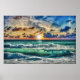 En digital konstdesign av en strand som kraschar vågar vid solnedgången.