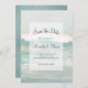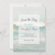Beach-temat bröllop spara datum-inbjudan har ett handmålat havslandskap av sand, hav och surfa i skuggor av grönt av akvblått och havsskum. Perfekt för nautiska, strand, destination, kustområden och tropiska bröllop. Originalteckningen KL Lagrar.