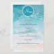 Beach, Watercolor Background Bröllop-meny Den här förbluffande bröllop-menyn fångar upp ett kusttemas fina skönhet med dess vattenfärgbakgrund i mjuka blå och beige toner, som påminner om havet och sandstränderna. Utformningen har ett runt ram med känsligt vitt kant, ge effekten av vinkar mjuk överlappning vid kusten. Parets namn är elegant skrivet i ett flytande skript och lägger till en romantisk tryckning, medan detaljerna visas i ett rent serif-teckensnitt i en varm guld-ton. Perfekt för en strand- eller destinationsbröllop, inbjudan är ren lugn och elegans och bjuder in gäster att gå med i ett firande fyllt med kärlek och naturskönhet. F008