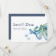 Bröllopet sparar datumkortets utformning med en vattenfärg blå bläckfisk med stjärnfisk. Använda mallen fält om du vill lägga till din anpassningsbar. beställ utskrivna kort eller ladda ned en elektronisk fil för e-post eller spara datuminbjudan som utskrivbara filer. Ett kust- och sjömansval för unikt strandtemat bröllop. Victoria Grigaliunas unika vattenfärgskonst och design