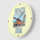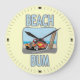 En vintage röd hot rod med lågor parkerade vid stranden med ett ytskikt bredvid och texten "Beach Bum"