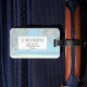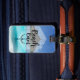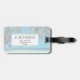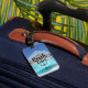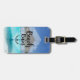 Personlig bagagetapp med en tropisk bild av lite kokokosnöt handflatan som sträcker sig ut över en isolerad vit sandstrand. Turkos tropiska vatten och azure blå himmel i bakgrunden. Serene och idyllic.