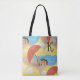 Summer beach bag all over artistic print. Illustrated beach chair coastal aesthetic pattern in large ogee format. Blue ocean water, beach sand and sunny yellow sky surround a single chair in the sand shaded by a faded red umbrella. The design was painted by hand using a digital program. Include a single initial in the upper righthand corner if you wish. This bag comes in two sizes and styles and is lined inside, with no zipper closure. Zippers will rust when taken to the beach often!