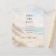 A watercolored sandy beach, sand dunes, ocean waves background. Personalize and add a date and your names. The text: Save the Date is written with a large trendy hand lettered style script.