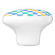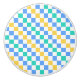 A colorful checkered pattern with alternating blue, green, and yellow squares on a white background. The design is vibrant and geometric, creating a playful tone.
