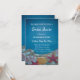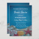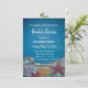 Blå möhippa-inbjudan, vackert blått hav-bröllop-tema med stjärnfisk och flerfärgade snäckor på vit sand