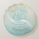 Den här rundan dekorativ kudde i det mjuka färgen av hav och sand gör det möjligt för dig att enkelt lägga till din egen namn och text med hjälp av den angivna mallen. Den enkla bilden av handflatan träd på en bedrövad, vattenfärgad bakgrund markeras med en vågaccent i aqua och vitt. Sök i ID623 för att se hur man samordnar inslag och ytterligare produkter i havet med denna design.