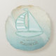 Den här rundan dekorativ kudde i det mjuka färgen av hav och sand gör det möjligt för dig att enkelt lägga till din egen namn och text med hjälp av den angivna mallen. Den enkla segelbåtsbilden med en tryckt, vattenfärgad bakgrund markeras med en vågaccent i akvarium och vitt. Sök i ID623 för att se hur man samordnar inslag och ytterligare produkter i havet med denna design.