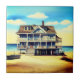 Keramiskt plattor i en illustration av ett idylliskt strandhus på stiltlar som är riktade mot det stillastående havet, med en liten båt som vilar på sandstranden. Himmel är ljust och delvis grumligt, vilket bidrar till den sereniska kustatmosfären.