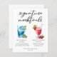 Den här chicen stranden namnteckning mocktails Meny lakan har en enkel svart typografi över två dryck i havet och deras ingredienser för party vid kusten. En söt blå hawaiisk sojabyck och alkoholfri jordgubbe Daiquiri teckning lägger till en coola till pub-menyn. Fyll i med parets namn och mottagningsdatum.