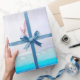 Anpassad presentförpackning. Ikoniska strandscen med främst blå och akvatisk färg. En personlig presentförpackning för perfekt som ingår i ett matchande produktsortiment.